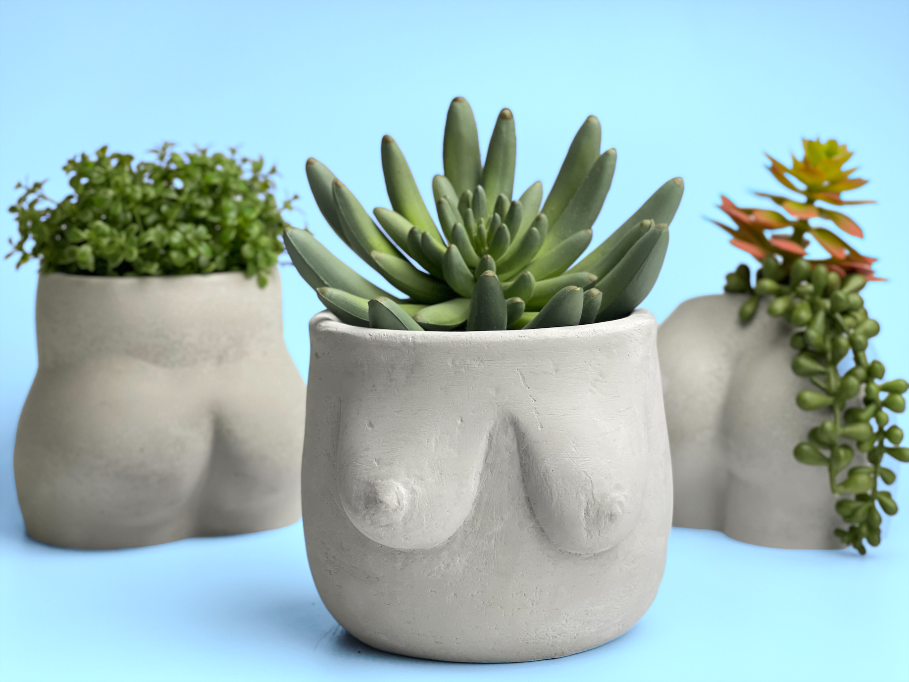 Show of your unique and creative side with this very stylish concrete boobs planter. This decorative pot will look amazing sitting anywhere from a living room to a porch or garden. The planter is suitable for growing succulents, herbs, cacti, or other small plants or flowers. You can also place dry flowers or faux flowers, pencils, paint brushes, rooting cuttings, starting seeds, growing houseplants, herbs, succulents, or air plants.