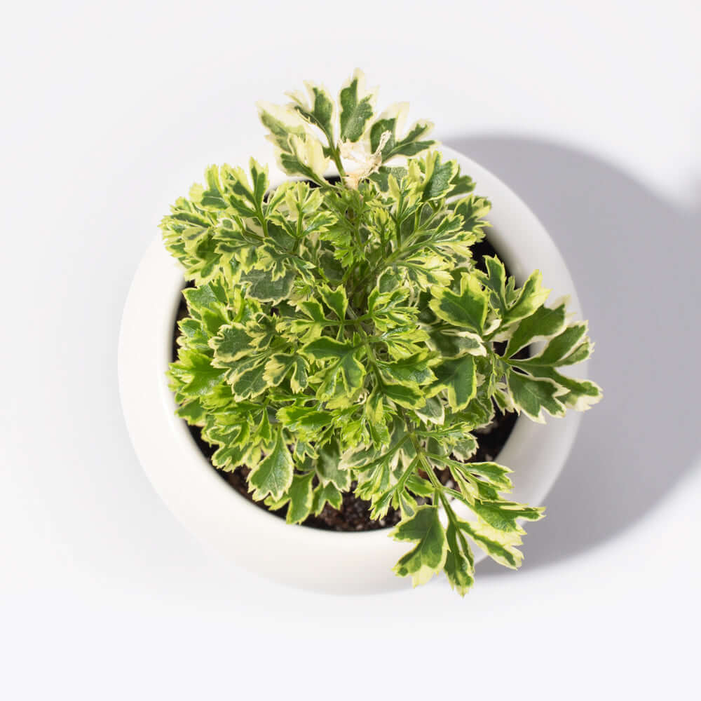 Ferny but feathery, bushy or tree-y. This gorgeous plant can be groomed to grow like a bonsai or tree style or more like a bushy full plant leaves (pun-intended) this plant to be your own creation based on the look you want. It grows slowly but can grow to over 6 foot tall with the right kind of care. You will fall in love with the variegated yellow edges on the green leaves and beautiful rewarding but easy to maintain plant the Ming Aralia is.