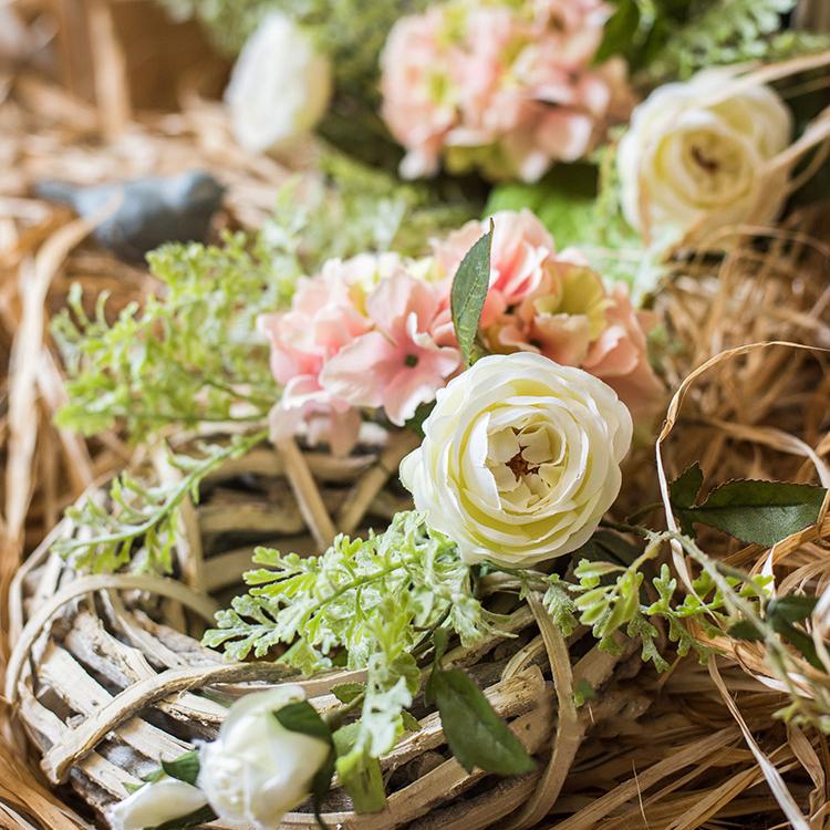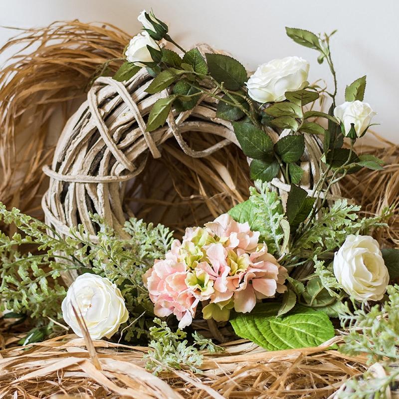 Faux Flower Wreath Pink Hydrangea White Rose on Rattan