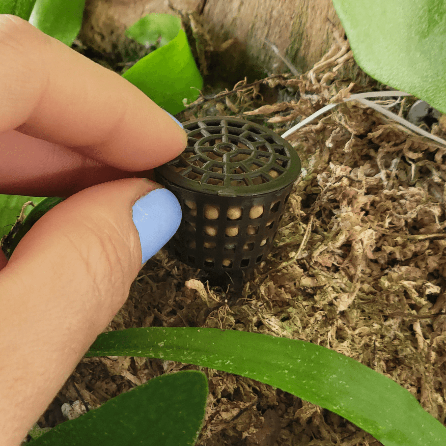This fertilizer is placed within a small basket that tucks in on the plant and provides nutrients whenever it is watered, we recommend leaving it on the plant. Because of its small size, it doesn't disturb your plant's roots or beauty.